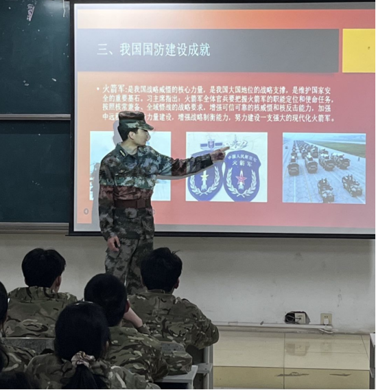 宣讲会上,刘福生教官为同学们播放了我国国防武器设备、疫情期间军人为人民冲锋陷阵等相关内容的视频;接着由王超教官讲解国防教育的概念、意义、重要性、我国国防建设成就以及我国面临的国防问题,他说“我们处在一个比较和平的年代,但仍然要居安思危,决不要做温床里的小绵羊”;最后,教官为同学们播放军人在军营生活的纪录片,让同学们更多的了解部队生活的细节。