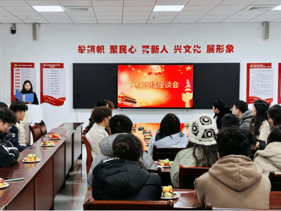 座谈会围绕“增进民族团结,共创和谐未来”主题展开。座谈会上,师生们首先共同学习了习近平总书记关于铸牢中华民族共同体意识的系列重要论述;然后土家族学生代表、彝族学生代表、藏族学生代表等分别介绍了本民族的民族特色、风俗习惯等,老师们和各民族学生代表进行了愉快的交流;最后,郝淑颖老师进行总结讲话。